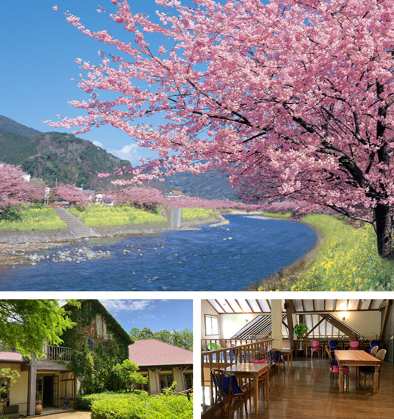 河津桜発祥の地として全国に知られており、2月に見頃を迎える河津桜、バラ、カーネーションなど年間を通して花と自然が目を楽しませてくれます。